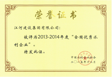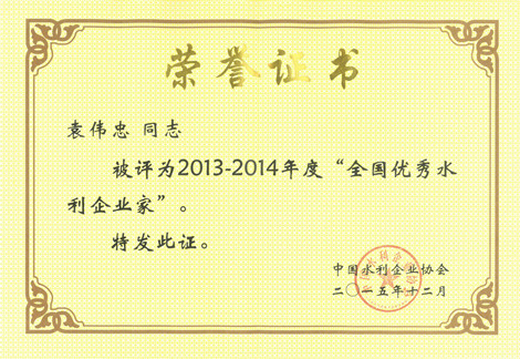 日前,中國水利企業協會發文表彰了2013-2014年度全國優秀水利企業、優秀水利企業家,我公司再次被授予“2013-2014年度全國優秀水利企業”榮譽稱號,董事長袁偉忠被評為“2013-2014年度全國優秀水利企業家”。