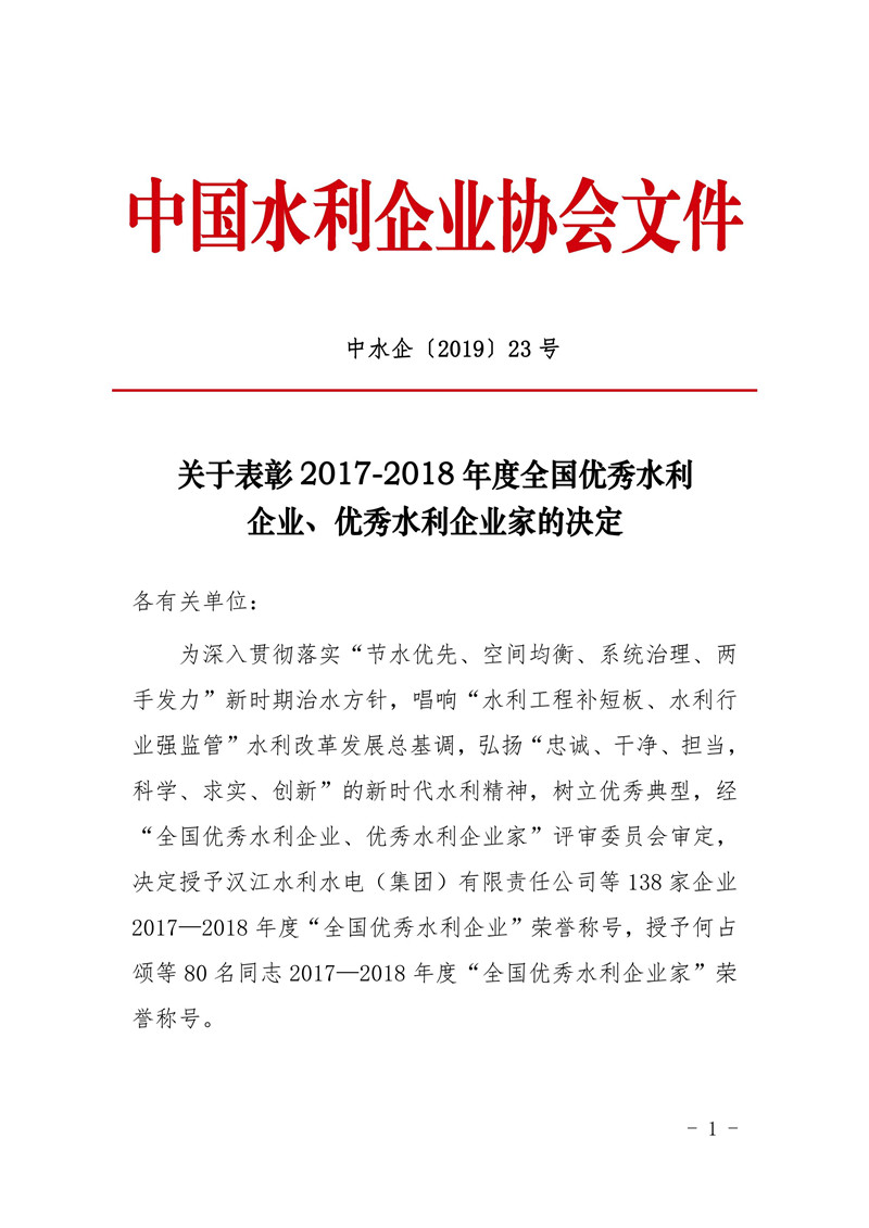 關于表彰2017-2018年度全國優秀水利企業、優秀水利企業家的決定