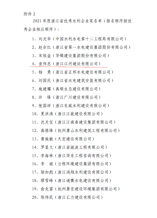 近日,浙江省水利建設行業協會公布了浙水建協(2022)6號文件,對我省一批水利企業、水利企業家、水利建造師、水利總監理工程師進行了表彰通報。其中浙江江河建設有限公司榮獲“2021年度浙江省優秀水利企業”,公司董事長袁偉忠獲“2021年度浙江省優秀水利企業家”稱號。