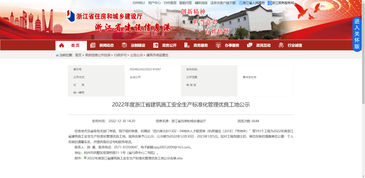喜訊-公司兩項目榮獲“2022年度浙江省建筑施工安全生產標準化管理優良工地”
