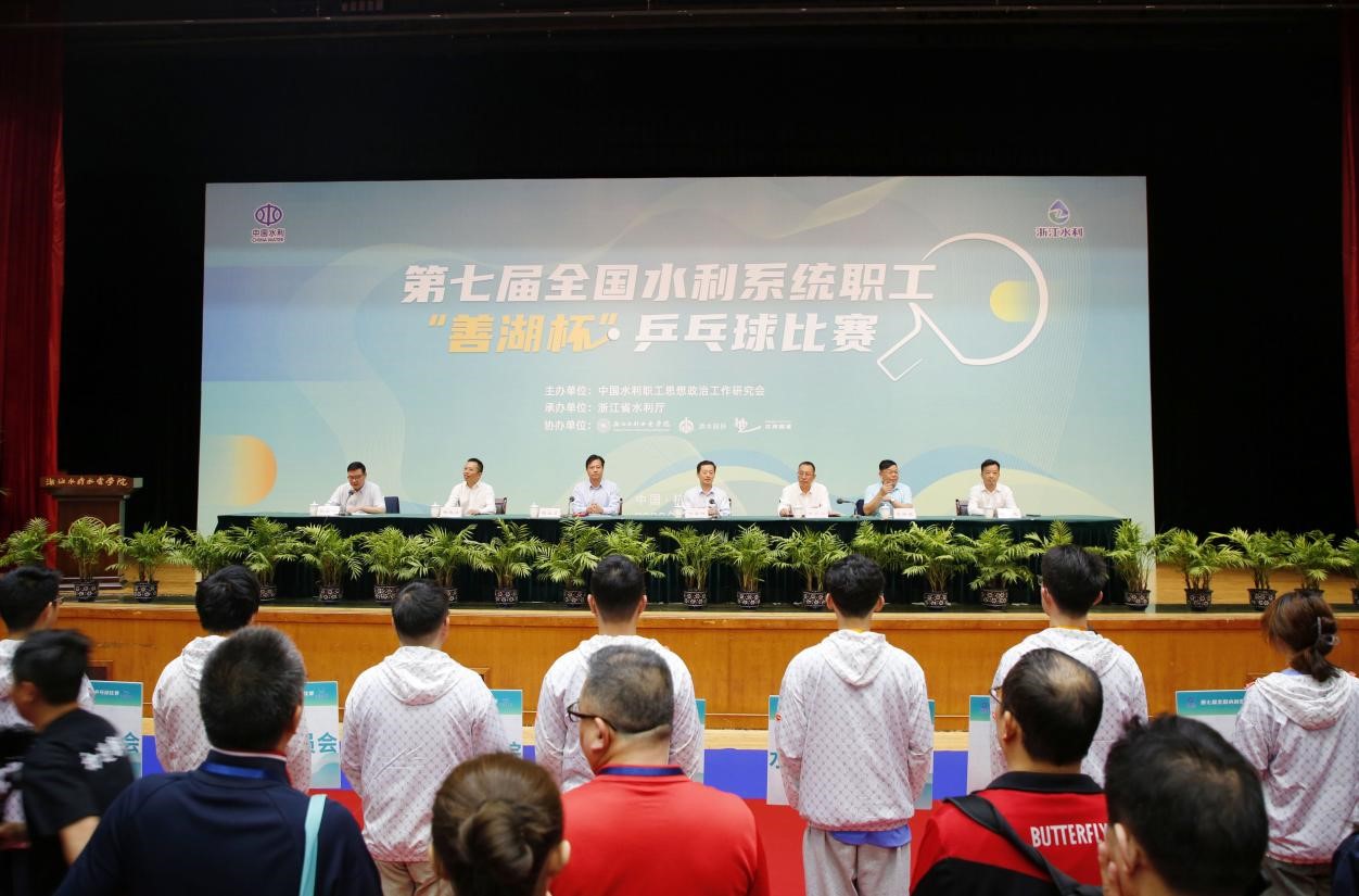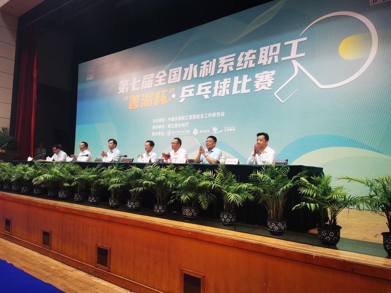 4月20日,由中國水利職工思想政治工作研究會(體協)主辦、浙江省水利廳承辦的第七屆全國水利系統“善湖杯”乒乓球賽在浙江水利水電學院錢塘校區體育館開幕。來自全國水利系統37家單位的63支代表隊(其中男子代表隊36個、女子代表隊27個)的領隊、教練員、運動員及裁判員共計350余人參加開幕式,我司協辦了本次賽事,董事長袁偉忠出席開幕式,并在主席臺就座。