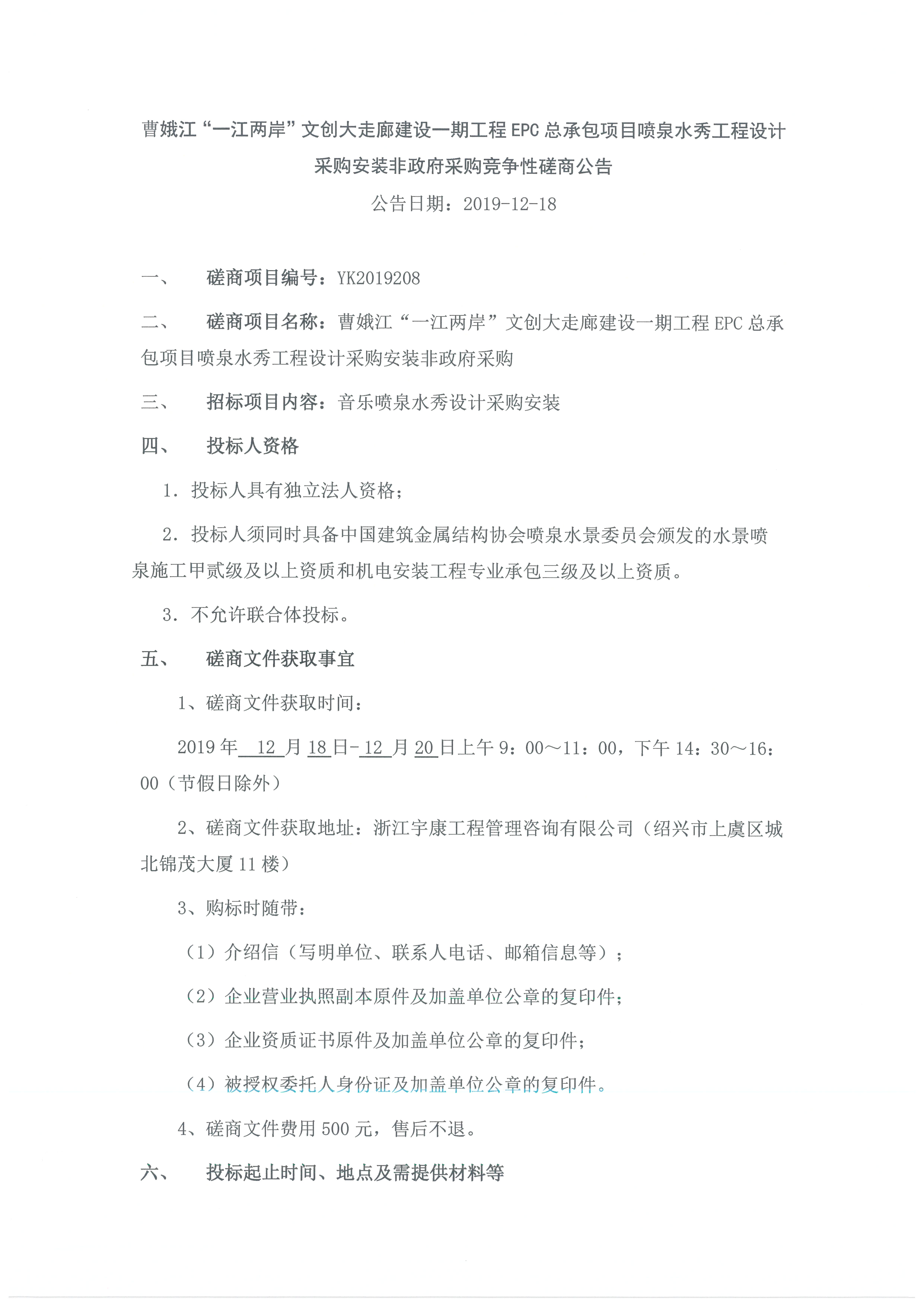 二、 磋商項目名稱:曹娥江“一江兩岸”文創大走廊建設一期工程EPC總承包項目噴泉水秀工程設計采購安裝非政府采購