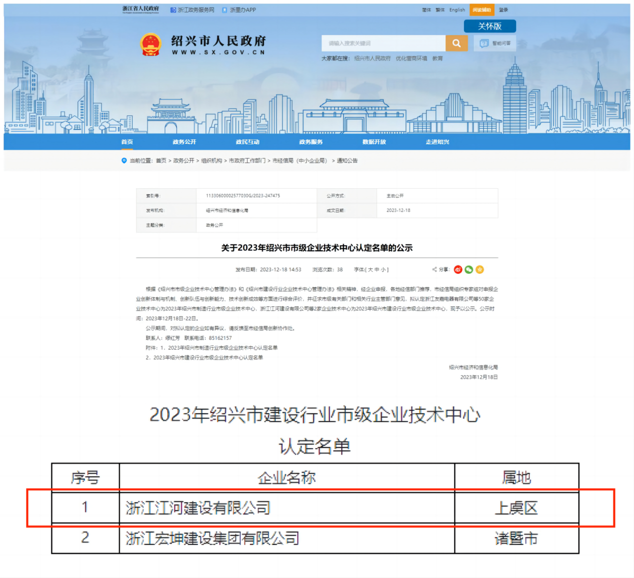12月18日,紹興市經濟和信息化局發布《關于2023年紹興市市級企業技術中心認定名單的公示》,其中浙江江河建設有限公司被認定為“紹興市市級企業技術中心”。這代表著主管部門對我司科技創新能力和成果轉化等方面取得成績的肯定,昭示著公司品牌形象及綜合實力再上新臺階。