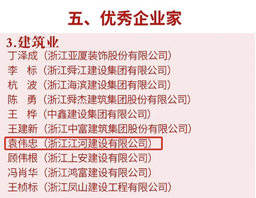 浙江江河建設有限公司獲得“建筑綜合實力廿強企業”,董事長袁偉忠獲得“建筑業優秀企業家”稱號,副總裁李京利獲得“優秀專技人才”稱號。