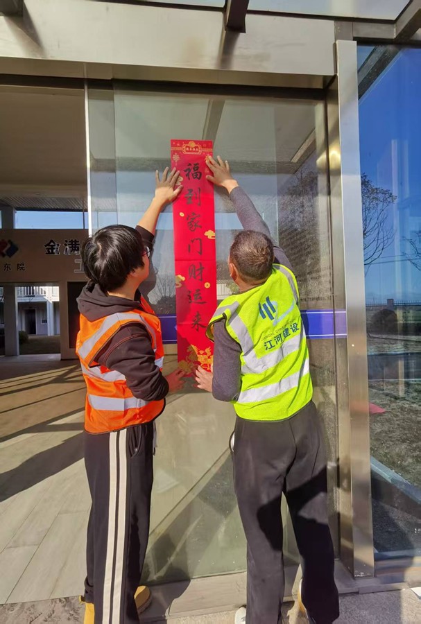 貼春聯環節同樣熱鬧非凡。大家手持紅聯,相互協作,小心翼翼地將春聯貼在項目部大門上,紅紅的春聯在陽光下格外醒目,為鋼筋水泥的工地增添了濃濃的節日喜慶,也讓“以工地為家”的堅守者們感受到了撲面而來的年味兒?;顒蝇F場還設置了“福字送福”環節,一張張飽滿喜慶的“福”字被職工們精心貼在門窗上,傳遞著“福滿工地、福澤民生”的美好期許。