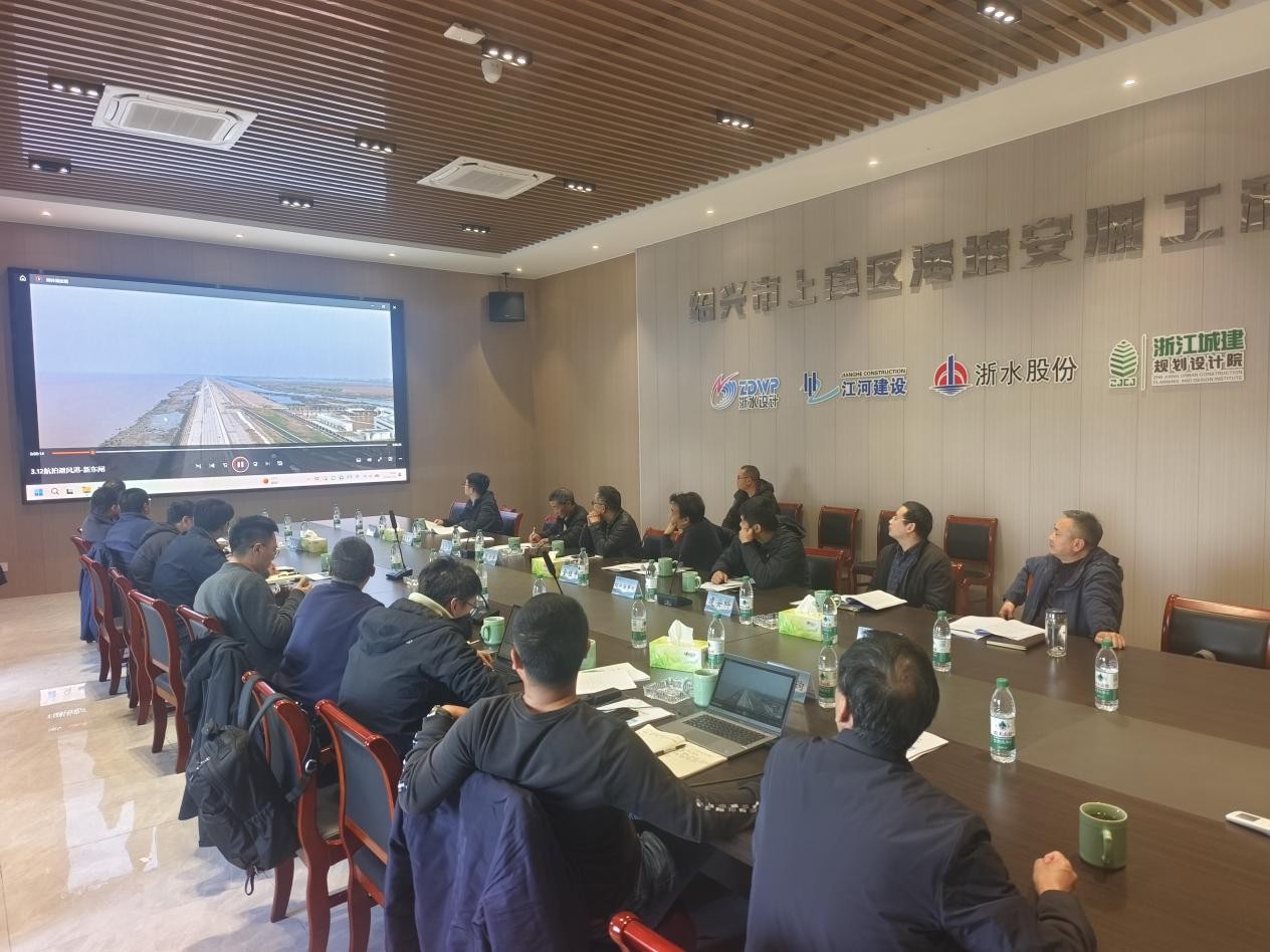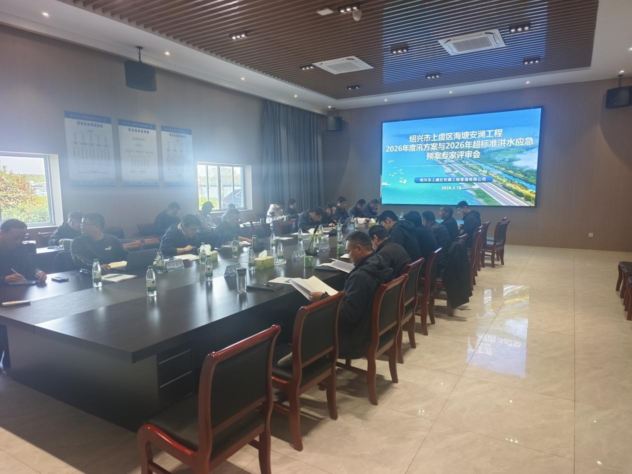 3 月 19 日,紹興市上虞區海塘安瀾工程 2026 年度汛方案與超標準洪水應急預案專家評審會在項目部會議室順利召開。會議由紹興市上虞區安瀾工程管理有限公司組織,特邀行業專家、江河建設等各參建單位代表參會,共同審議工程度汛與應急處置相關方案。